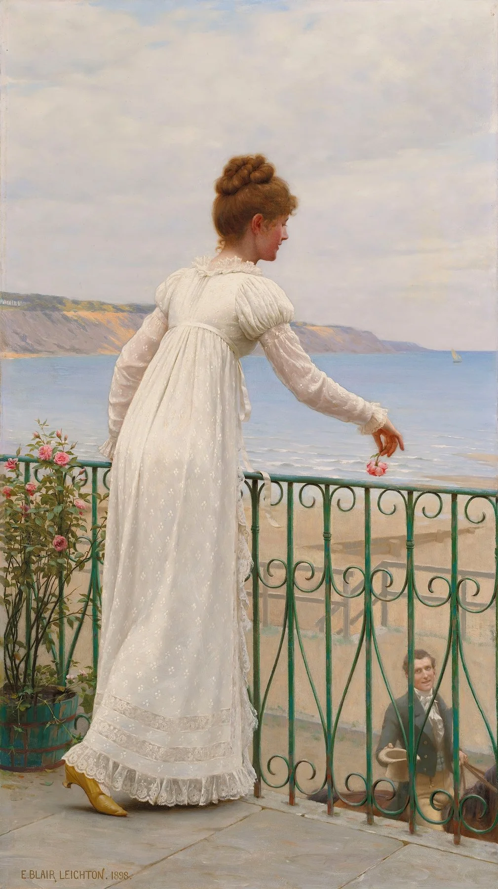 Not quite “Bridgerton” times this elegant, modern lady in white is contrasted by the beautiful red flowers and chair and is reminiscent of lead crystal vases, pearls, and satin. She’s a stunning beauty baring her bare back to us. Ever so elegant in her flowing dress, the background of this painting matches the color of her hair and isolates her as the main subject that deserves attention.